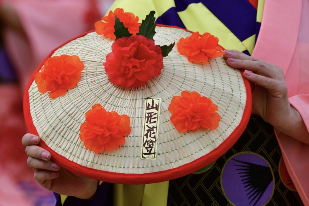 祭りの主役は、色鮮やかな衣装と、県の花「紅花」をあしらった花笠を手に踊る、たくさんの踊り手たち。勇壮な花笠太鼓のリズムに合わせて、数万人もの踊り手が街を埋め尽くす光景はまさに圧巻です。